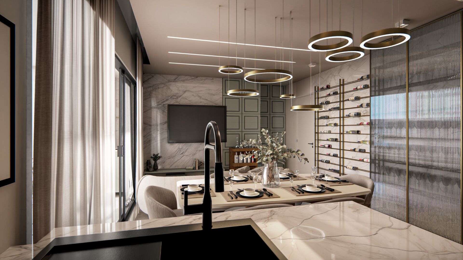 O living integrado à cozinha cria ambientes amplos e conectados, perfeitos para receber amigos ou momentos de convivência diária. Cada detalhe foi pensado para combinar sofisticação e praticidade: